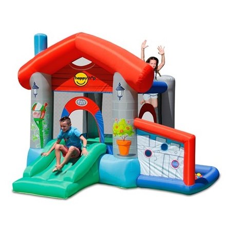 מתקן קפיצה בצורת בית משולב עם עמדת כדורים ומגלשה.