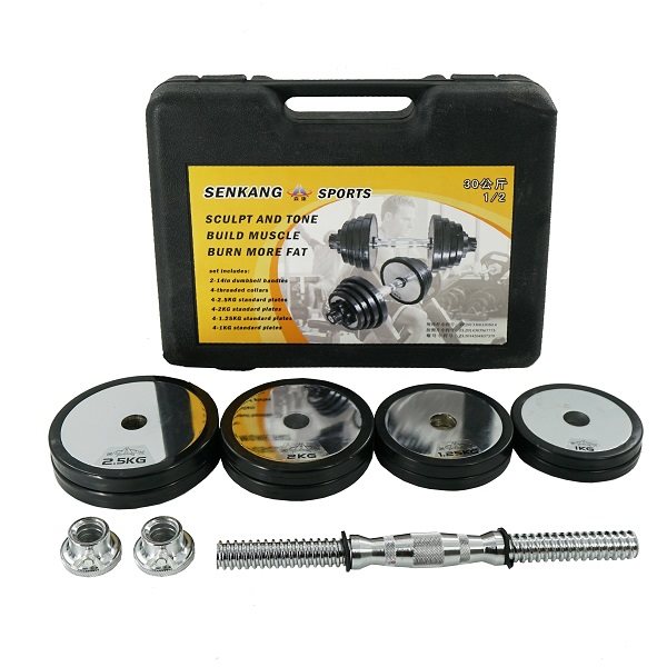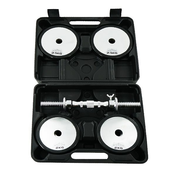 סט משקולות מפואר במזוודה עם גימור מרהיב, פלטות משקל עשויות כרום מכוסה בטבעת גומי.