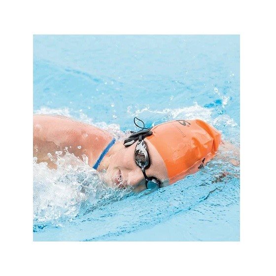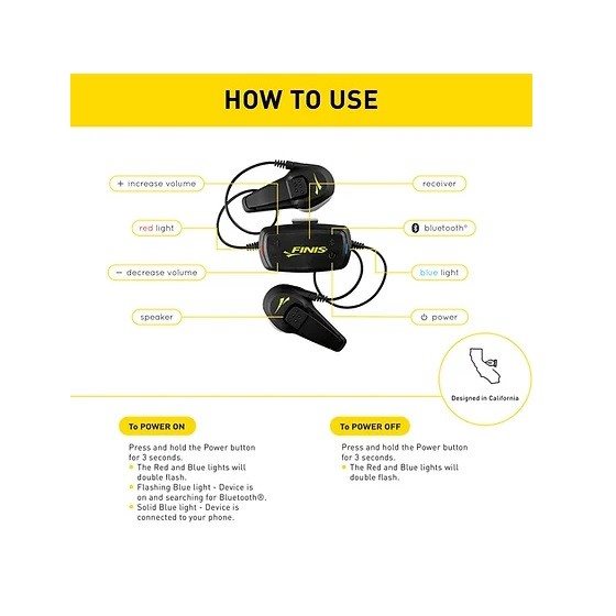 Swim Coach Communicator פועל באמצעות אות Bluetooth® חכם ועד למקלט הממוקם בחלקו האחורי של ראשו של השחיין.