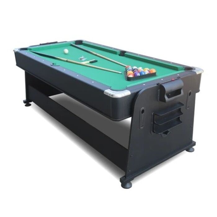 שולחן ביליארד 4 ב1 בצבע חום עם בד ירוק.