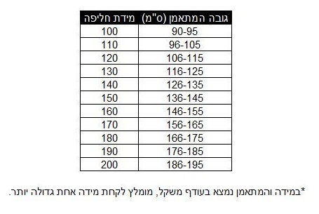 מידות לבחירה: 90, 100, 110, 120, 130, 140, 150, 160, 170, 180 ס"מ